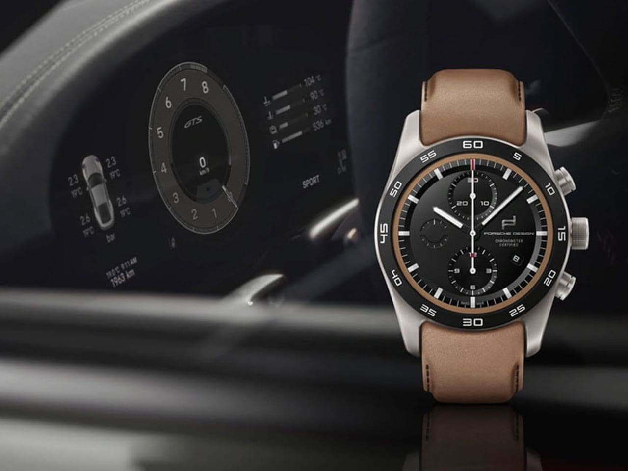 The dial is visually derived from the instrument cluster and the rev counter of the Porsche 911 and, as is customary for Porsche Design, reduced to the essentials: White numerals and indices on a matt Black background with finely differentiated line geometries and configurable hands that are perfectly legible thanks to anti-reflective sapphire crystal.